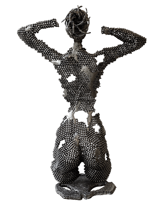La modèle et l’artiste cherchent ensemble la position idéale qui participe à la réalisation d’une œuvre de qualité à taille humaine. C’est une étape primordiale de l’amorce de conception. À partir des moulages, il vient ensuite à l’aide de billes en acier habiller celui-ci avec minutie. Ces molécules métalliques sont soudées une à une lui donnant la structure d’un solide maillage.